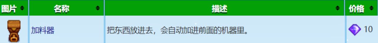 放置加料器,然後在加料器的前方放置一個機器,再把材料放到加料器中,它就會把裏面的材料加到前面的機器,比如我放置了一個加料器,然後我在它前面放了一個小桶,這時我把水果放入加料器中,它就會自動把水果加到前面的小桶中,使小桶工作,但這個加料器只負責加入材料不負責取走成品,如果它面前的小桶工作完畢了,那加料器也就不工作了,你必須去把果酒拿走,加料器纔會繼續投入,就挺雞肋的,我試過把史萊姆孵化器或鴕鳥孵化器放它前面,但每次孵化後還是要你去與這個加料器互動一下它纔會繼續加入,我能想到它唯一的用處就是換一大堆,然後全放在小桶的後面,這樣你每次就只用收酒不用釀酒了,但這是理想狀態,現實狀態是齊鑽壓根沒那麼多,而且小桶還要重新移動很麻煩,所以總結下來這個加料器實在沒用