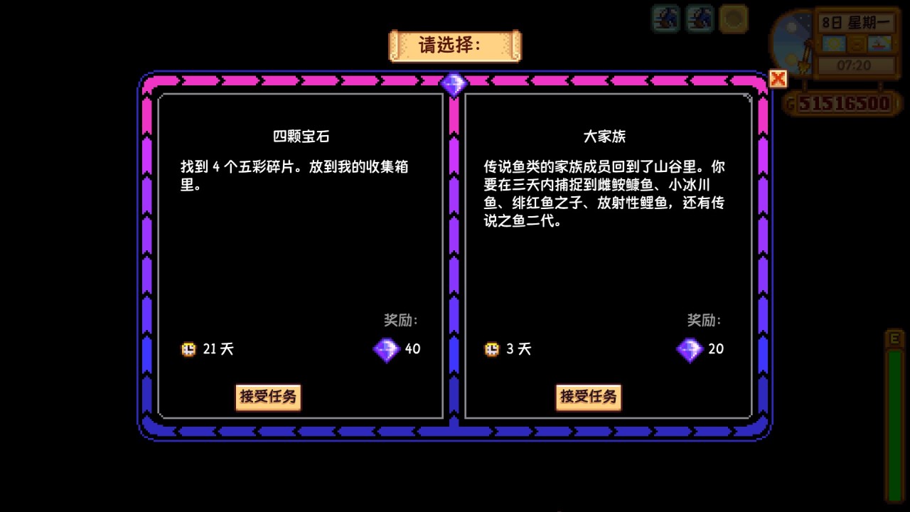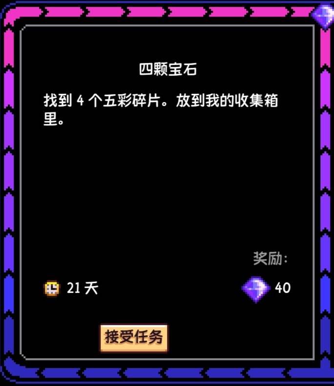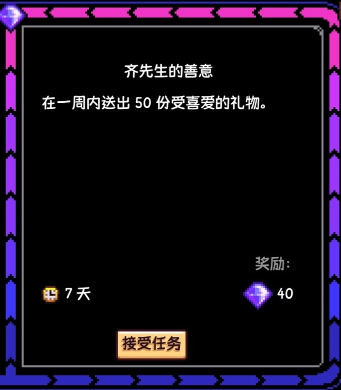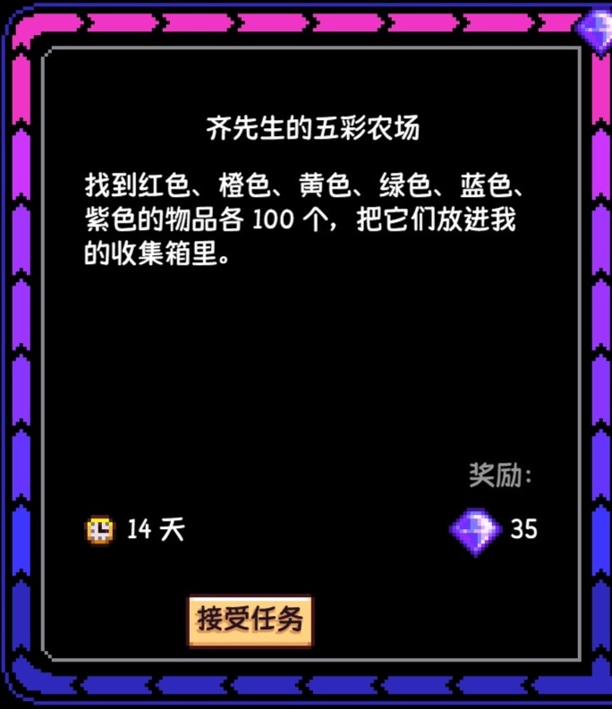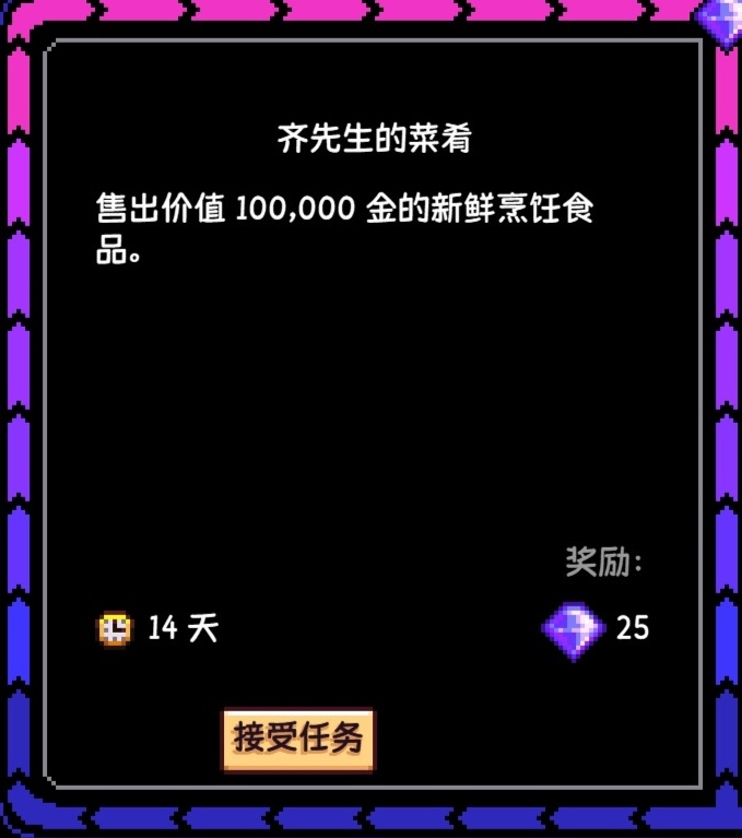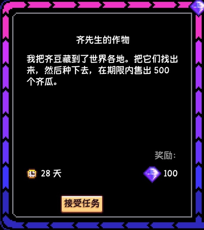 (注:任務完成或結束後,所有地方的齊豆和齊瓜都會清空,齊瓜本身不值錢,這個任務的時間限制在每個季節的首日刷到纔是28天,之後每過一天都會減少一天,最低會減至14天,即每週一如果重新刷到的話,最低天數會是14天,大家在每個季節的首日刷到可以接一下,後面刷到就不推薦接了,因爲時間也不夠)