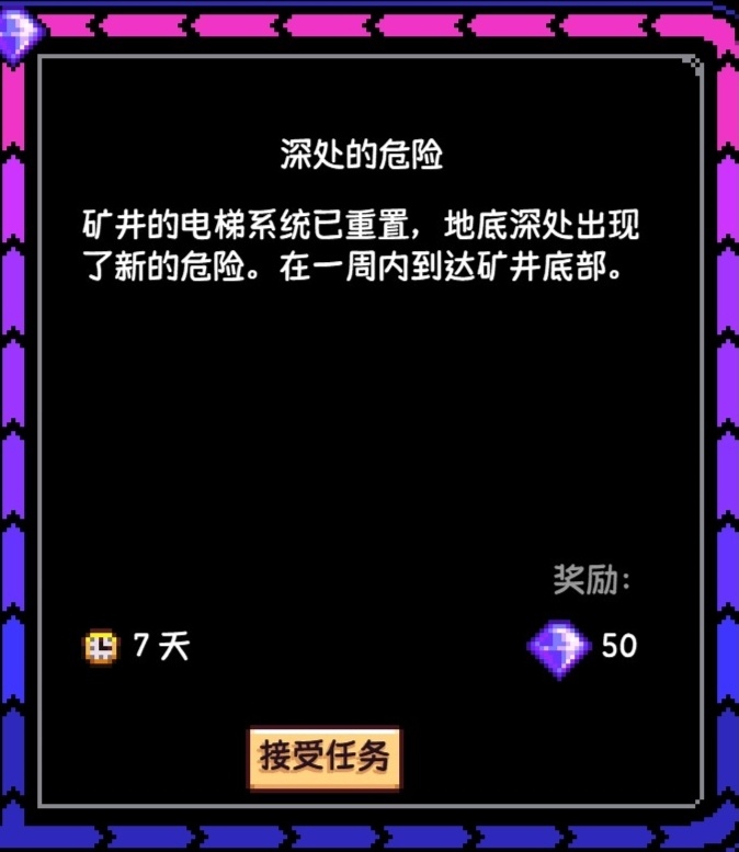 該任務在剛開始時的優先度很高,就是說你至少要完成一次這個任務,碰到的話直接接就行,在該任務期間,普通礦井會變成困難礦井,裏面的怪物會加強,同時還會生成新怪物,而且電梯不能用,在一週內到達礦井120層即可完成任務,直接用樓梯無腦下就行,沒難度,至於我爲什麼說你至少要完成一次這個任務,因爲你只有在完成這個任務後,才能在礦井120層自由選擇是否開啓困難礦井,選擇“是”則隔天生效,困難礦井中有概率生成放射性礦石,同時裏面的獎勵也比普通礦井好,即礦物、資源、擊殺怪物後的戰利品等