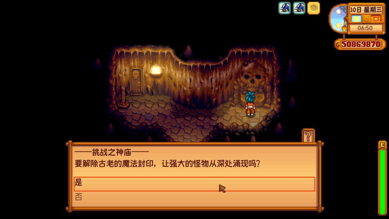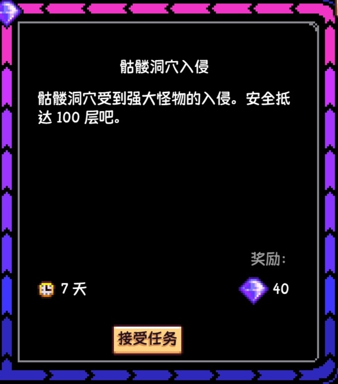 這個任務跟上面“深處的危險”一樣,在任務期間骷髏洞穴會變成困難級別,裏面的怪物會得到加強,同時還會生成新怪物,對應的,裏面會生成放射性礦石,礦物、資源、擊殺怪物後的戰利品也比普通的骷髏洞穴多,難度和獎勵一起提高,七天內到達骷髏洞穴的100層即可完成任務,直接用樓梯下就行,沒難度,當你完成一次這個任務後,你就能在骷髏洞穴中自由選擇是否要開啓困難級別,選擇“是”則隔天生效