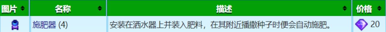 把施肥器安裝在灑水器上,再把肥料放入施肥器裏,當你在該灑水器範圍內播種時,裏面的肥料會自動加到你播種的那塊土地裏,也就是說幫你省了一個步驟,以前你是要播種完再施肥,安裝施肥器後可以播種和施肥同時進行,看着效果很好,但其實用不上,因爲大家基本都只在姜島農場大量施肥,但姜島農場施肥是能永久保留的,也就是隻用施肥一次就行,那就完全沒必要去換施肥器,只能用一次的同時耗費的齊鑽也多,不值得,如果你實在想用,那可以等大後期你齊鑽很多的時候,可以買回來放在自家農場的灑水器上,就當錦上添花了