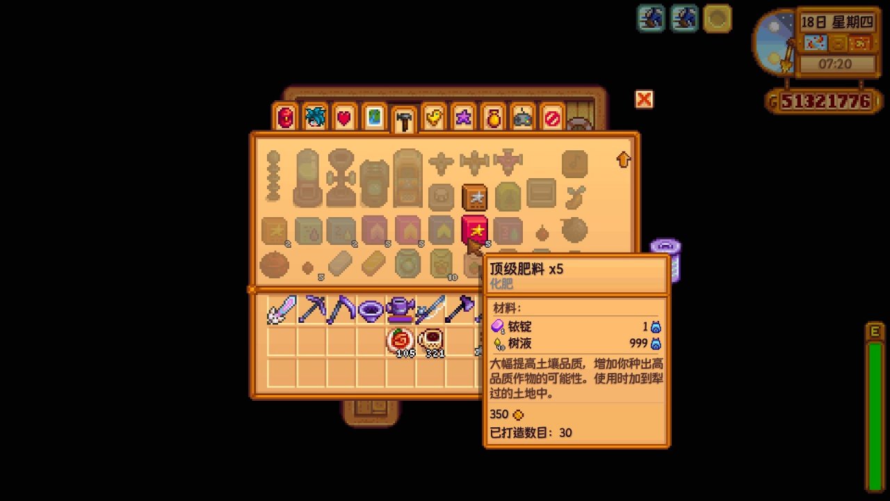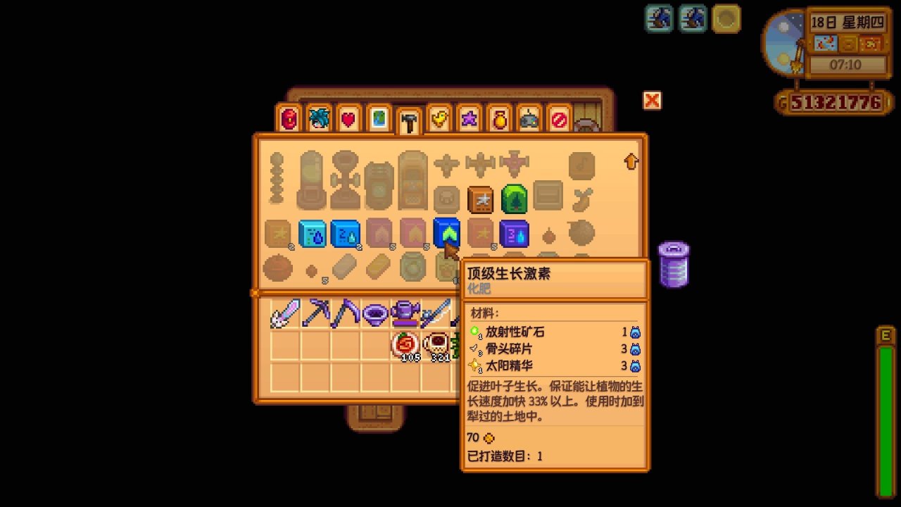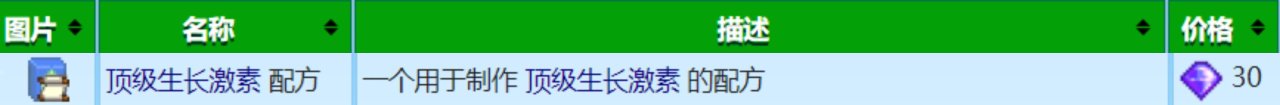 頂級生長激素可以使農作物的生長速度加快33%(生長激素爲10%,高級生長激素爲25%),對於可多次收穫的作物,比如上古水果,生長激素只會加快它第一次成熟的時間,對後續成熟後的產出時間沒有影響,跟上面的重型樹液採集器一樣,效果看着很強,但也是屬於前期用不到,後期用不上的道具,而且製作材料還需要放射性礦石,很難量產,不過由於100%完美度和遊戲成就都跟製作配方全收集掛鉤,所以還是要換的,很重要