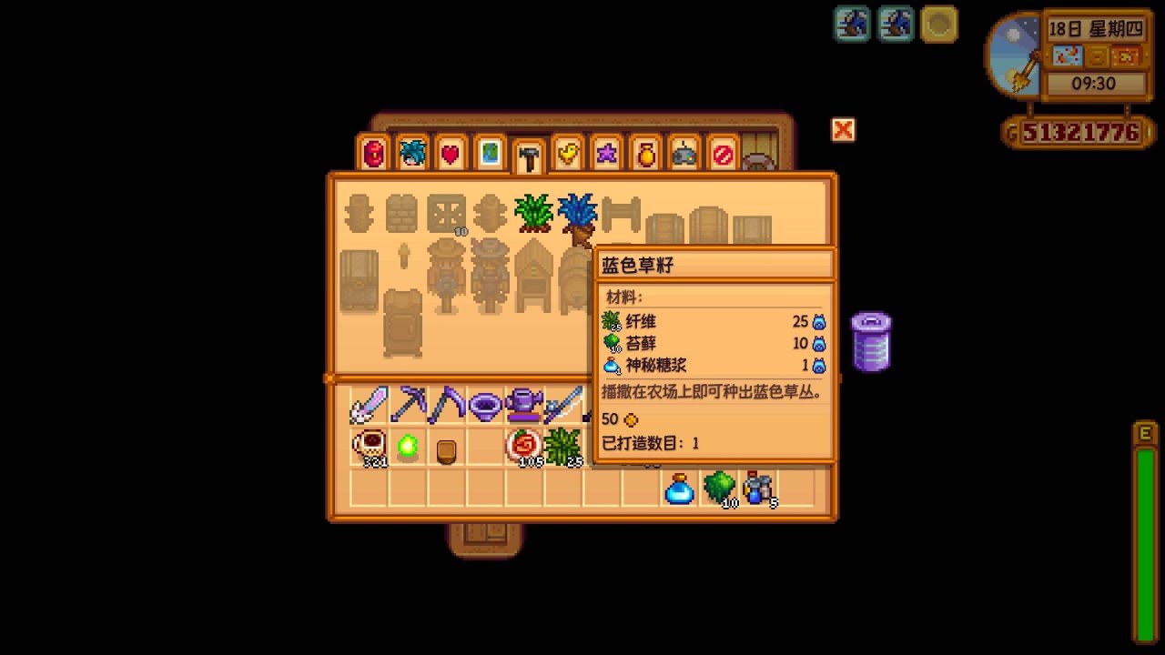 這個是藍色草籽的製作配方,製作藍色草籽需要耗費25纖維➕10苔蘚➕1神祕糖漿