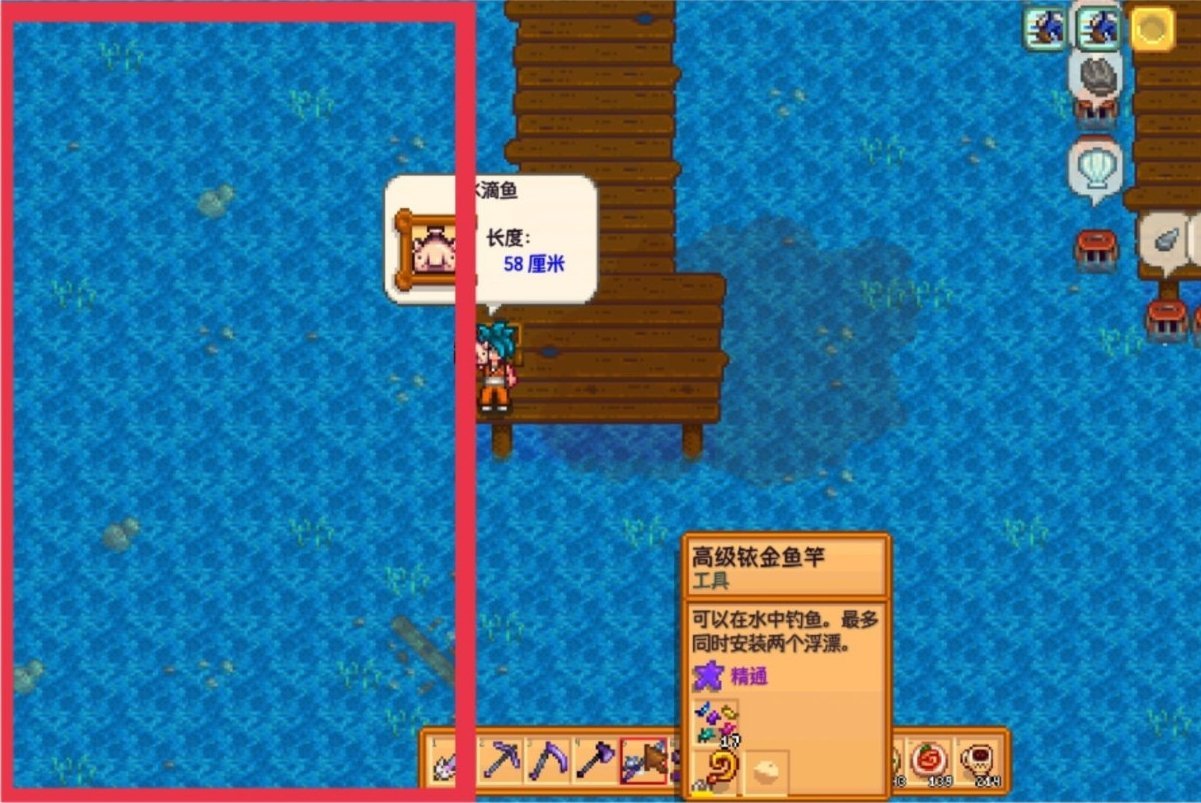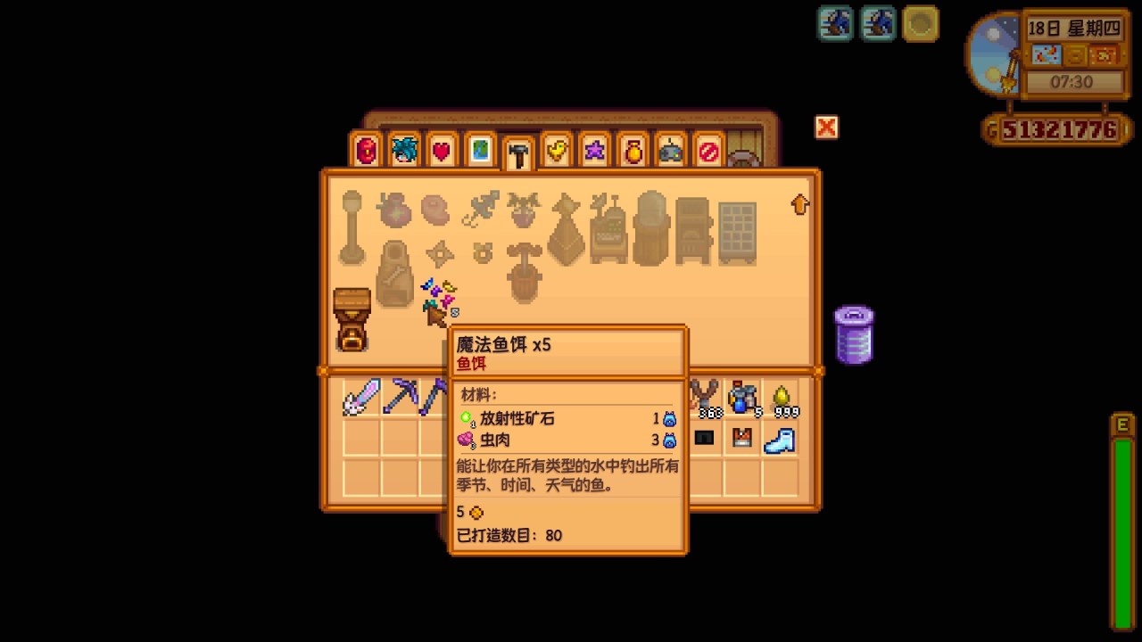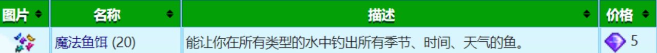 可以使玩家在釣魚時無視季節、天氣、時間的限制,即裝備魔法魚餌後,你就有概率釣起對應水域中的所有魚類,包括各種魚王,而且魔法魚餌也可以使魚上鉤的時間減少50%,總的來說就是一個方便你全魚類收集的道具,比如說如果你差比目魚,比目魚只在春/夏兩季出現在海域,可你又在秋季的話,那裝備魔法魚餌到海域釣魚就有概率釣到比目魚,這樣就不用等到明年了,這個也是根據各位自己需求去兌換