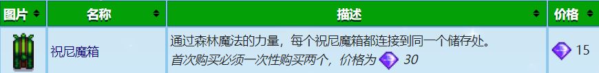 這個箱子在第一次兌換時必須換兩個,後續可以換一個,該箱子的儲存空間只有九格,所有祝尼魔箱都共用一個儲存空間,意思就是說比如你在農場裏放了一個祝尼魔箱,在別的地方也放了一個,那當你把物品放到任意一個祝尼魔箱裏時,你在別的祝尼魔箱中也能取出來,我個人感覺用處不大,除非你打了自動化mod,據說這玩意是自動化mod的神