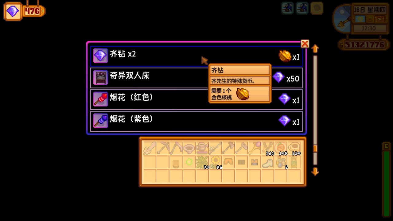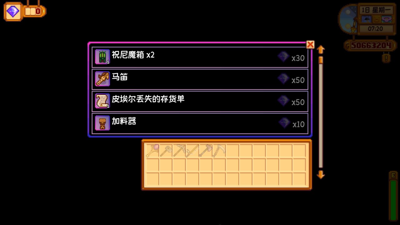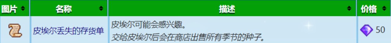 把皮埃爾丟失的雜貨單贈送給皮埃爾後,他的雜貨店就會全年出售四季的種子,如果不是當季的種子,價格會貴50%,這個還是蠻有用的,在後期補全出貨時可以快速購買對應種子