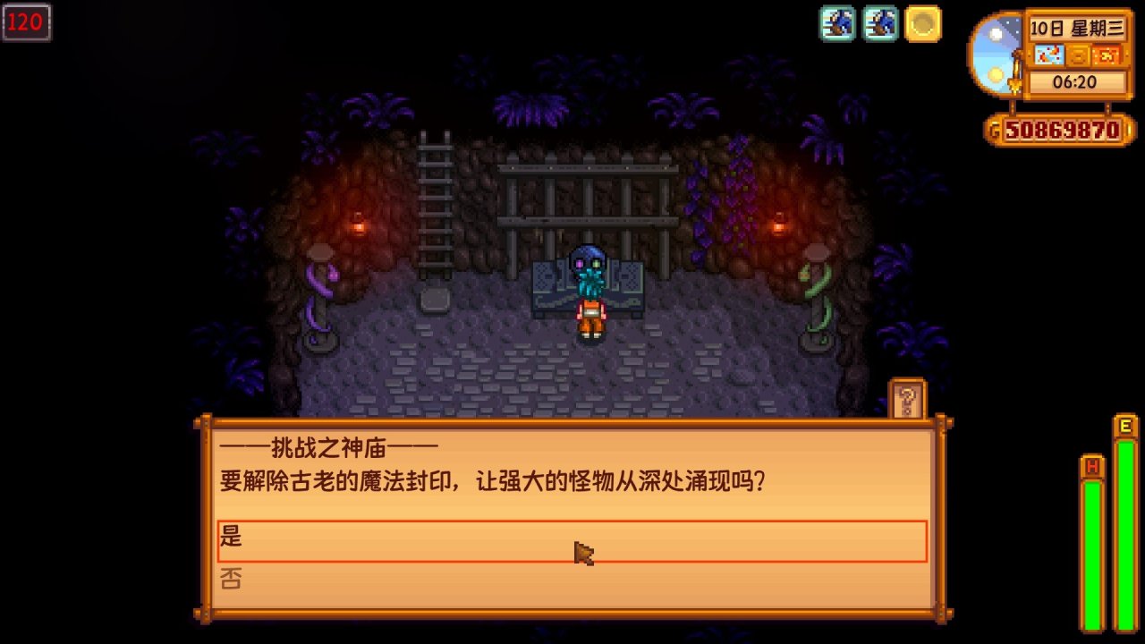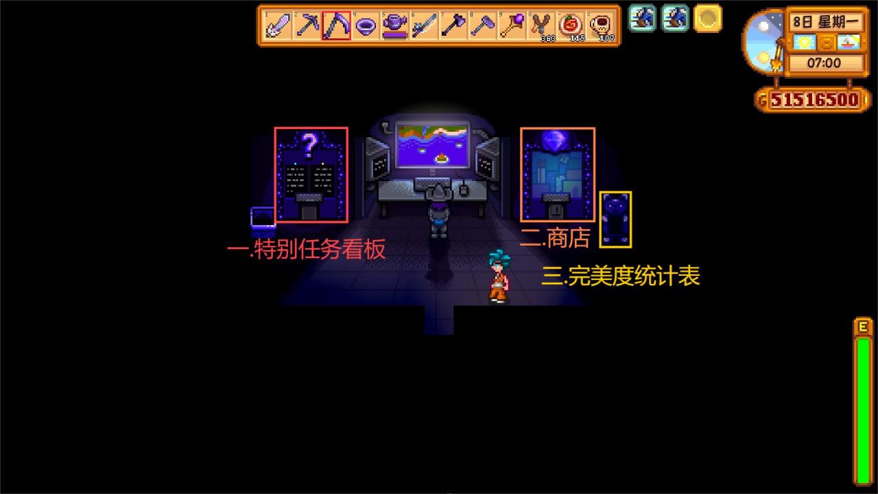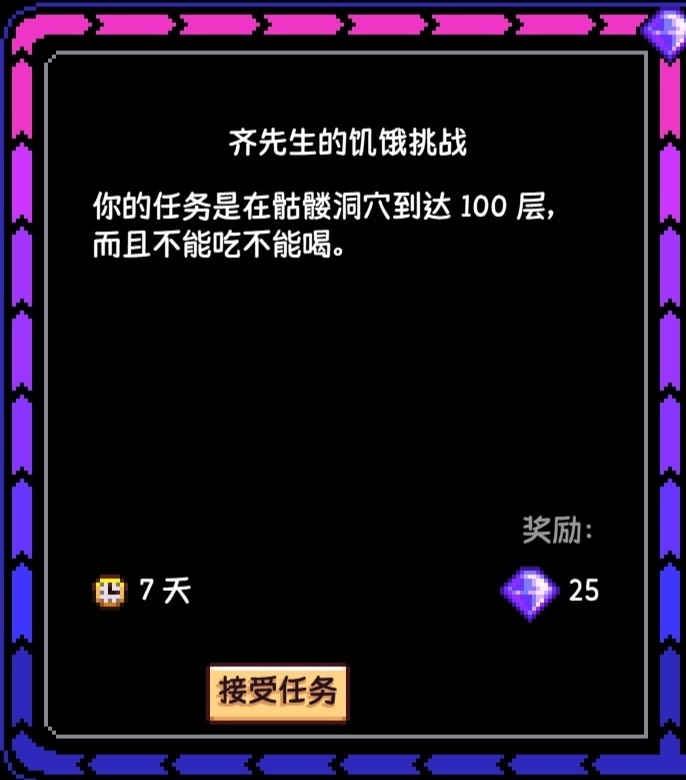 在任務期間到達骷髏洞穴100層,而且不能食用任何食物,這個也很簡單,用寶石複製機複製翡翠,每週日到沙漠商人那換樓梯,然後直接用100個樓梯一路搭到100層即可(你也可以自己用石頭製作樓梯,不過我相信玩到這裏的玩家肯定都有很多樓梯了)