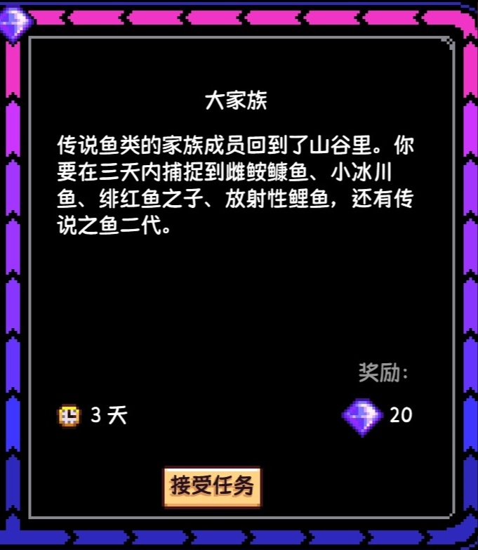 在該任務期間,所有傳說魚類都會被它們對應的家族成員取代,你在該任務期間只能釣到上述任務中所提到的魚類,釣不到傳說魚類,不過在任務期間這些家族成員可被無限捕獲,沒有條數限制,也沒有天氣、季節限制,但釣魚等級還是有限制,上述家族成員與傳說魚類的釣點相對應