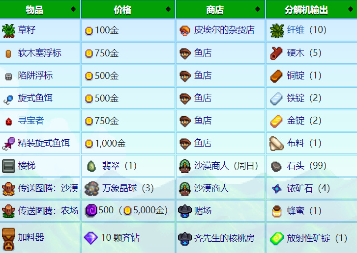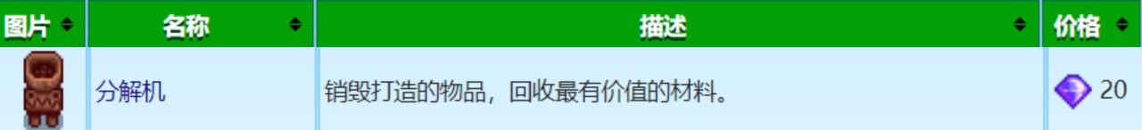 工作時間60分鐘,它會把你放入裏面的物品進行一個分析,然後把其中打造材料最貴的物品返還出來(根據出貨箱的售賣價格計算),我這裏舉個例子,比如你放入的是產油機,產油機的製作材料是50史萊姆泥➕20硬木➕1金錠,50個史萊姆泥的售出價格是250金,20個硬木的售出價格是300金,1個金錠的售出價格是250金,那麼60分鐘後分解機會把20個硬木返還出來,因爲20個硬木的售出價格是最高的,如果你有鐵匠技能的加成,1個金錠的售出價格就會變成375金,這時分解機就會分解出1個金錠,沒有打造配方和可一次製作多個的物品是不能被放入分解機中的,這裏分解機有妙用,你可以到其它商店中購買物品,再把這件物品放入分解機中分解出材料,就相當於間接買材料了,這樣間接買材料有時會比你直接買要便宜,或是間接買到一些平時根本買不到的材料,有點用,看各位自己存檔的需求了,下圖是列舉的一些個別物品