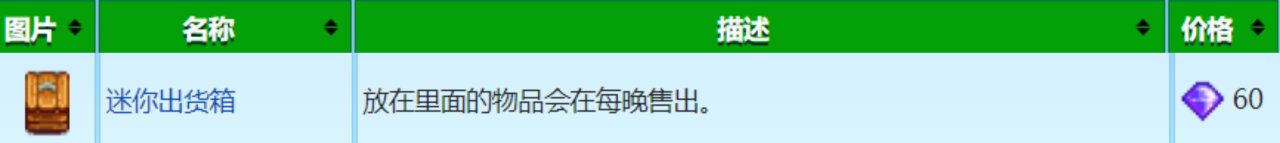 跟出貨箱差不多,放在裏面的物品會在當晚睡覺時出售,但迷你出貨箱可以移動,也可以使用十字鎬或斧頭敲掉,迷你出貨箱只有九個格子,你最多隻能放入九種物品,當格子堆滿後你就不能再放入其它物品了,放置在裏面的物品在當天任意時間內可隨時拿走,總體用處不大,沒必要換,60齊鑽也不便宜