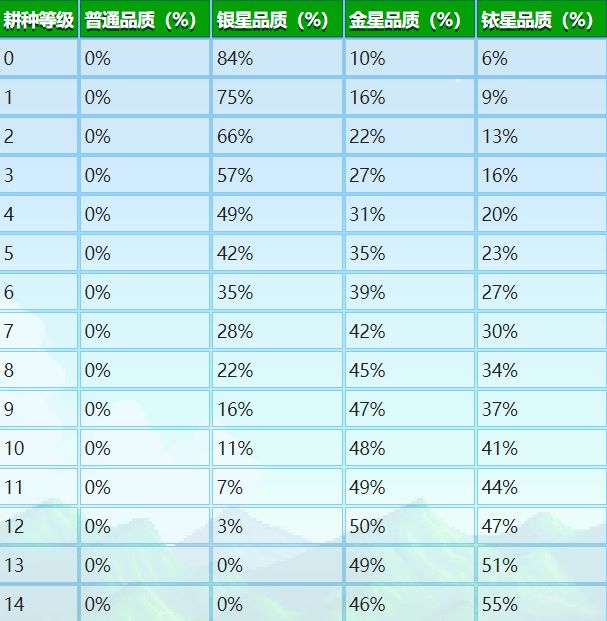 撒上頂級肥料的作物在收貨時將有幾率獲得銥星品質,這是目前遊戲中唯一可以得到銥星品質農作物的辦法,頂級肥料隻影響第一個作物的收穫,就是說如果你種的是土豆、藍莓、蔓越莓這些在收穫時有概率額外產出農產品的農作物,這些額外產出的農產品一般都不會喫到肥料加成,下圖爲在使用頂級肥料後,不同耕種等級下收穫農作物品質的概率