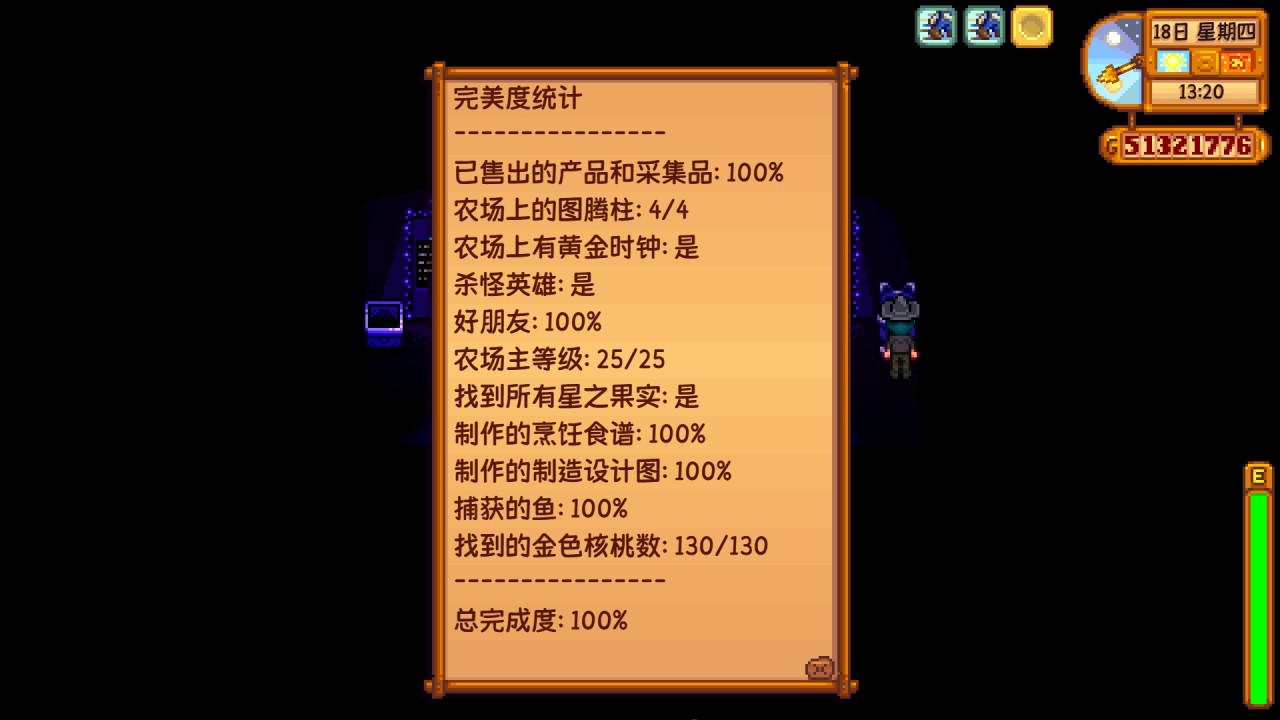 這個完美度統計表是我們遊玩的最終目標,完成裏面的各個挑戰,完美度達成100%後,你就能解鎖遊戲結局,這個存檔也就結檔了,結檔後也能繼續遊玩,沒有影響,想打遊戲結局和全成就的玩家都必須得去完成,這裏面涉及的內容很多,下面我放一篇我之前寫的攻略,都是針對這部分去說的,大家感興趣可以看看,這裏寫不完,實在太長了:《星露穀物語》頂峯相見!山頂結局的達成攻略