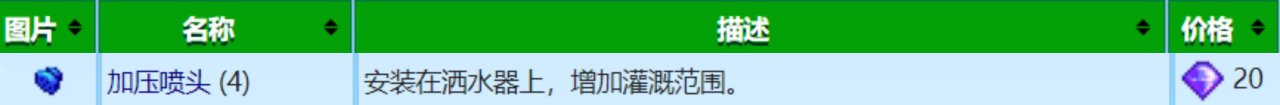 這個加壓噴頭我不推薦大家去換,沒必要,這個加壓噴頭的主要作用就是可以減少你灑水器的擺放,增加你的種植面積,但都到這個時候了,我覺得你應該也不缺錢了吧,就算缺錢,你應該也不差這幾塊地,總之把齊鑽留着換更有用的物品,不用去換這個,除非你想美觀農場,或者後期齊鑽多得沒地花,那可以去換一下,跟上面的施肥器一樣,錦上添花的效果吧