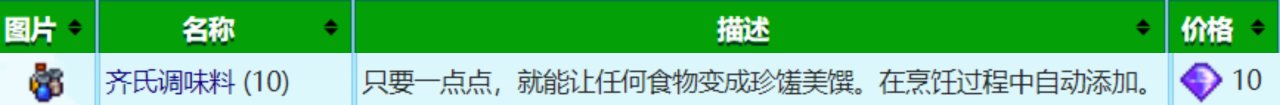 把齊氏調味料放在揹包或冰箱中,烹飪時就會自動消耗,它可以讓你做出的食物變成金星品質,金星品質的食物對於普通品質的食物會有以下三個區別: