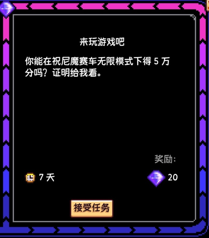 這個任務我不推薦去接,因爲祝尼魔賽車這個遊戲很難玩,5萬分的要求也高,而且獎勵還只有20齊鑽(所有特殊任務裏最低的獎勵),總之這個特殊任務在我心目中是最難完成的,獎勵和難度根本不成正比