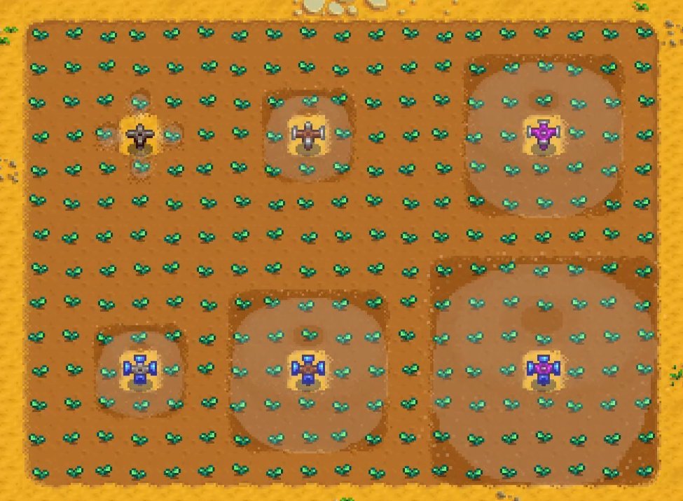 把加壓噴頭安裝在灑水器上,可以增加灑水器的灌溉範圍,灑水器會從十字灑水器變成3×3範圍,優質灑水器會從3×3範圍變成5×5範圍,銥制灑水器會從5×5範圍變成7×7範圍,具體對比如下圖所示,雖然灑水器有四個噴口,但只需一個加壓噴頭就能全部裝上,加壓噴頭和施肥器不能同時裝備