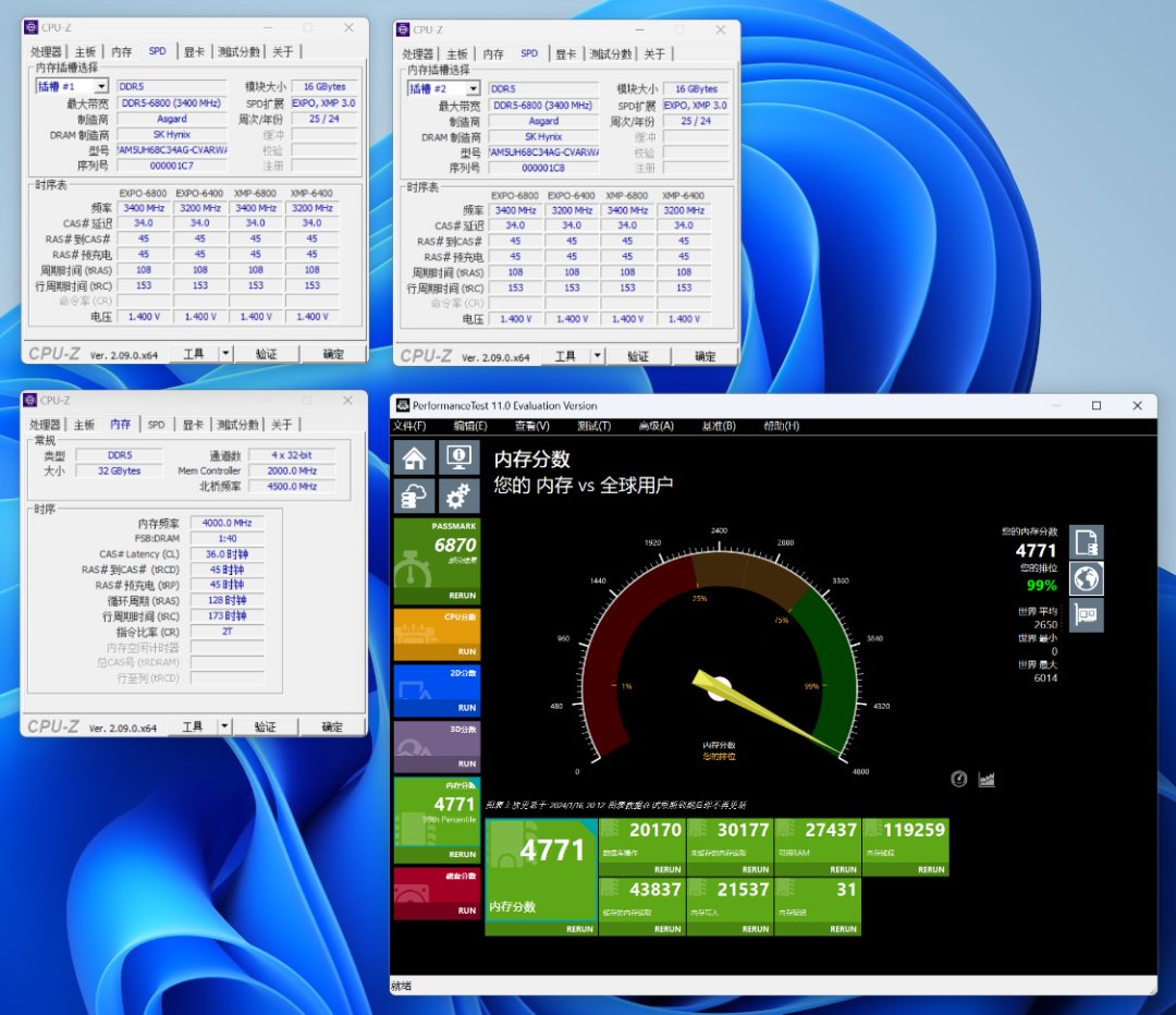 將內存XMP至6800MHz後,內存得分36.9W分;