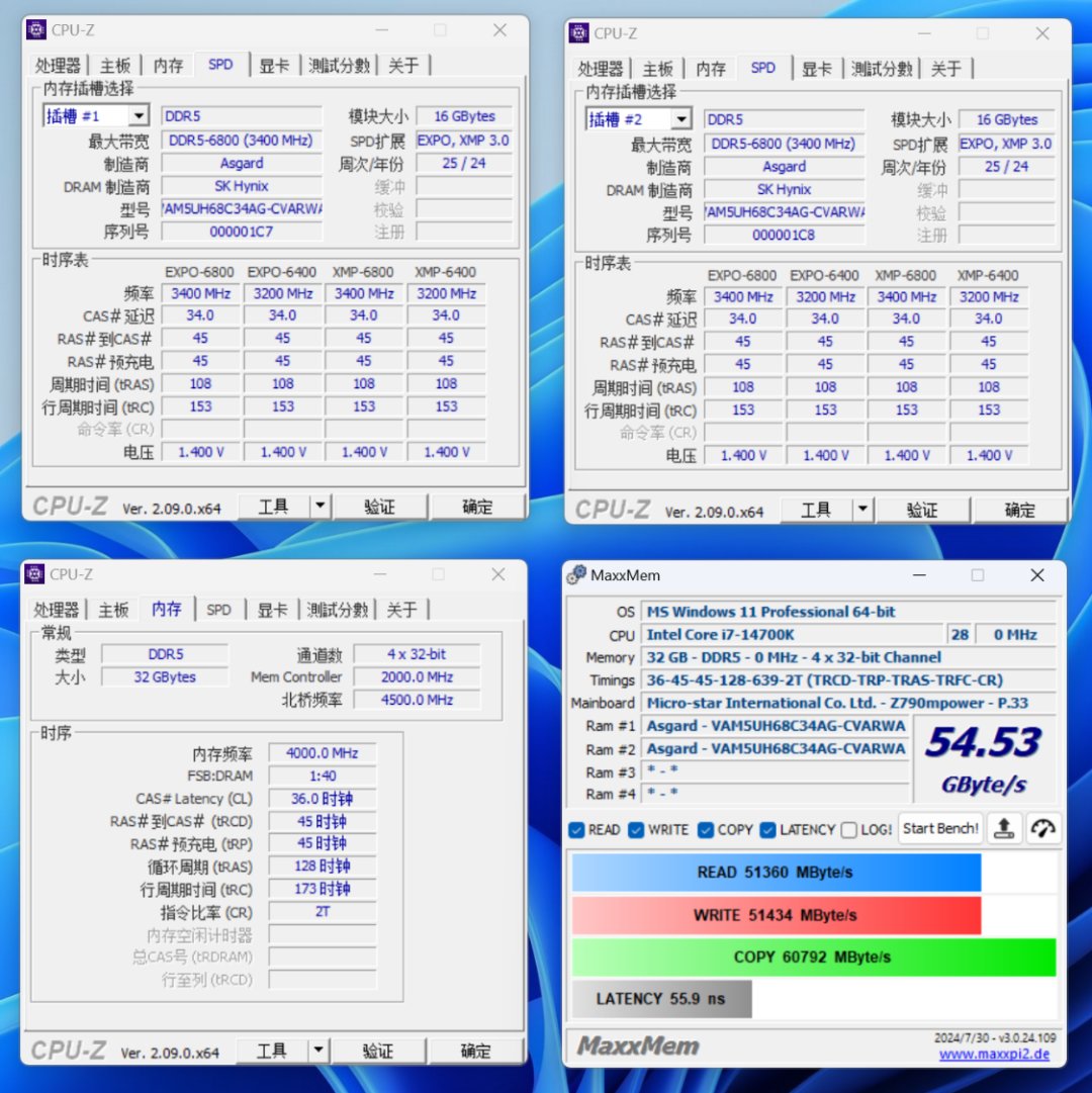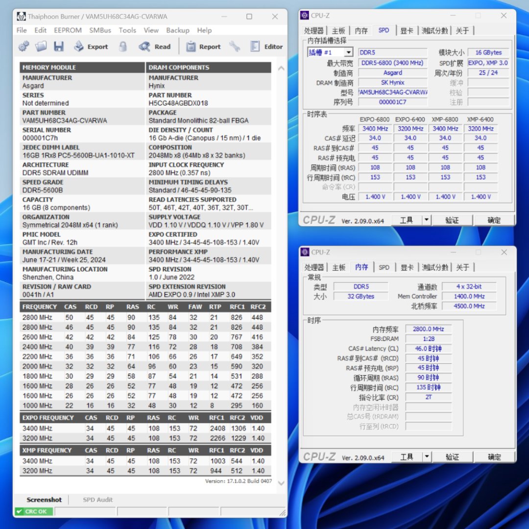 內存馬甲採用了不可拆卸設計(咱就不霸蠻了),因此我們通過軟件查看內存的SPD信息,可知這套內存採用了全新的海力士高性能A-DIE顆粒,顆粒型號H5CG48AGBDX018,內存默認頻率爲5600MHz,並且內存還支持兩檔XMP與EXPO內存超頻技術,兼容性表現優秀;
