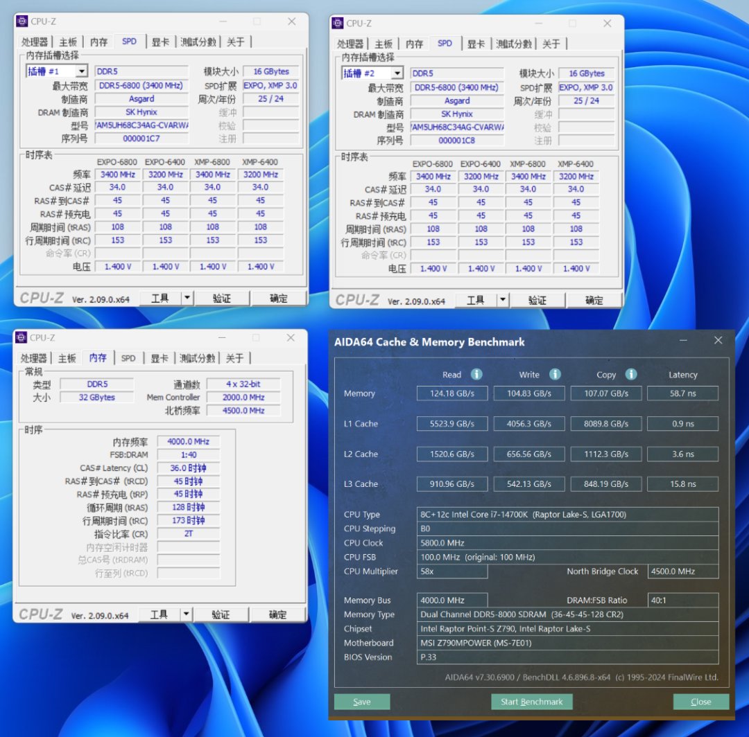 使用Memory Try It!將內存OC至8000MHz C36,內存讀取速度爲124.18 GB/s,寫入速度爲104.83 GB/s,複製速度爲107.07 GB/s,延時爲58.7 ns;