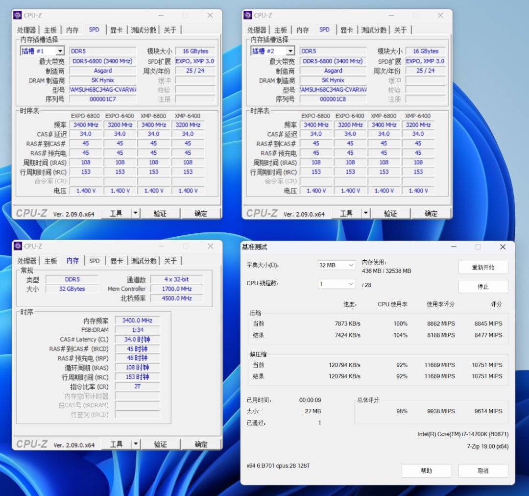 將內存XMP至6800MHz後,多線程解壓縮評分可以達到182262 MIPS,單線程解壓縮評分可以達到9614 MIPS;