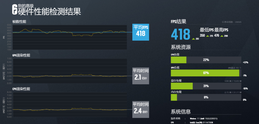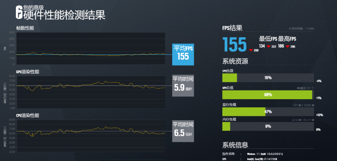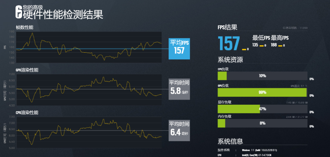 《彩虹六號》基準測試,畫質超高,渲染比例100%,內存XMP至6800MHz後,4K分辨率下,遊戲平均幀率爲155 FPS,1080P分辨率下,遊戲平均幀率爲418 FPS;