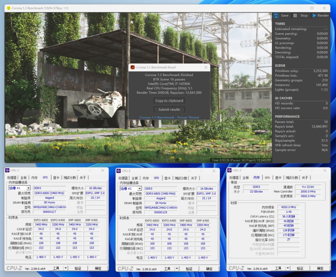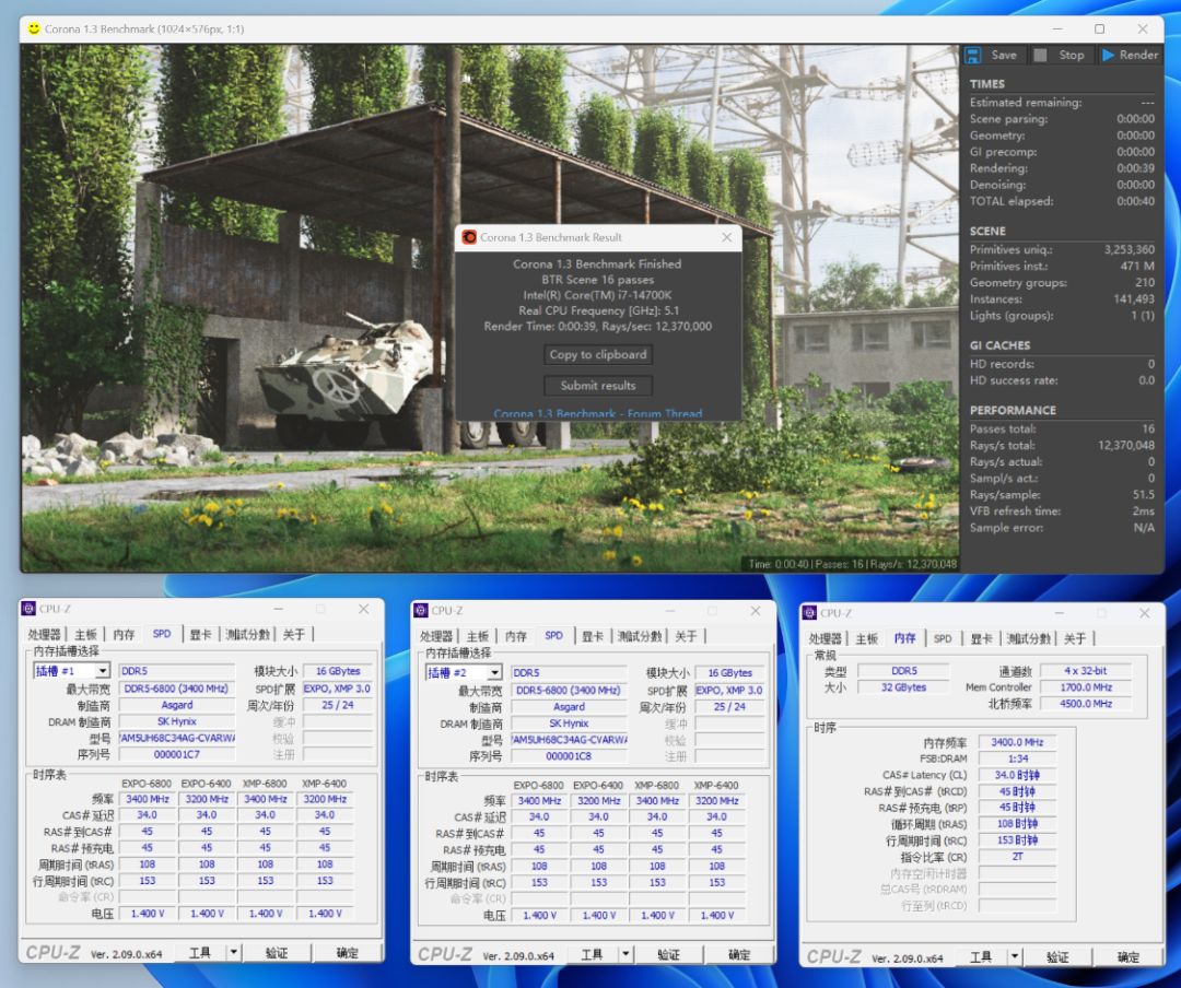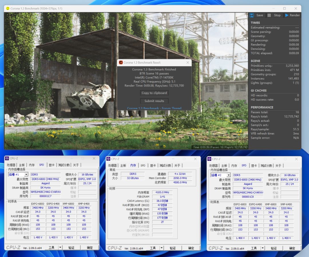 將內存XMP至6800MHz後,渲染耗時39秒,渲染速度12370000 Rays/Sec;