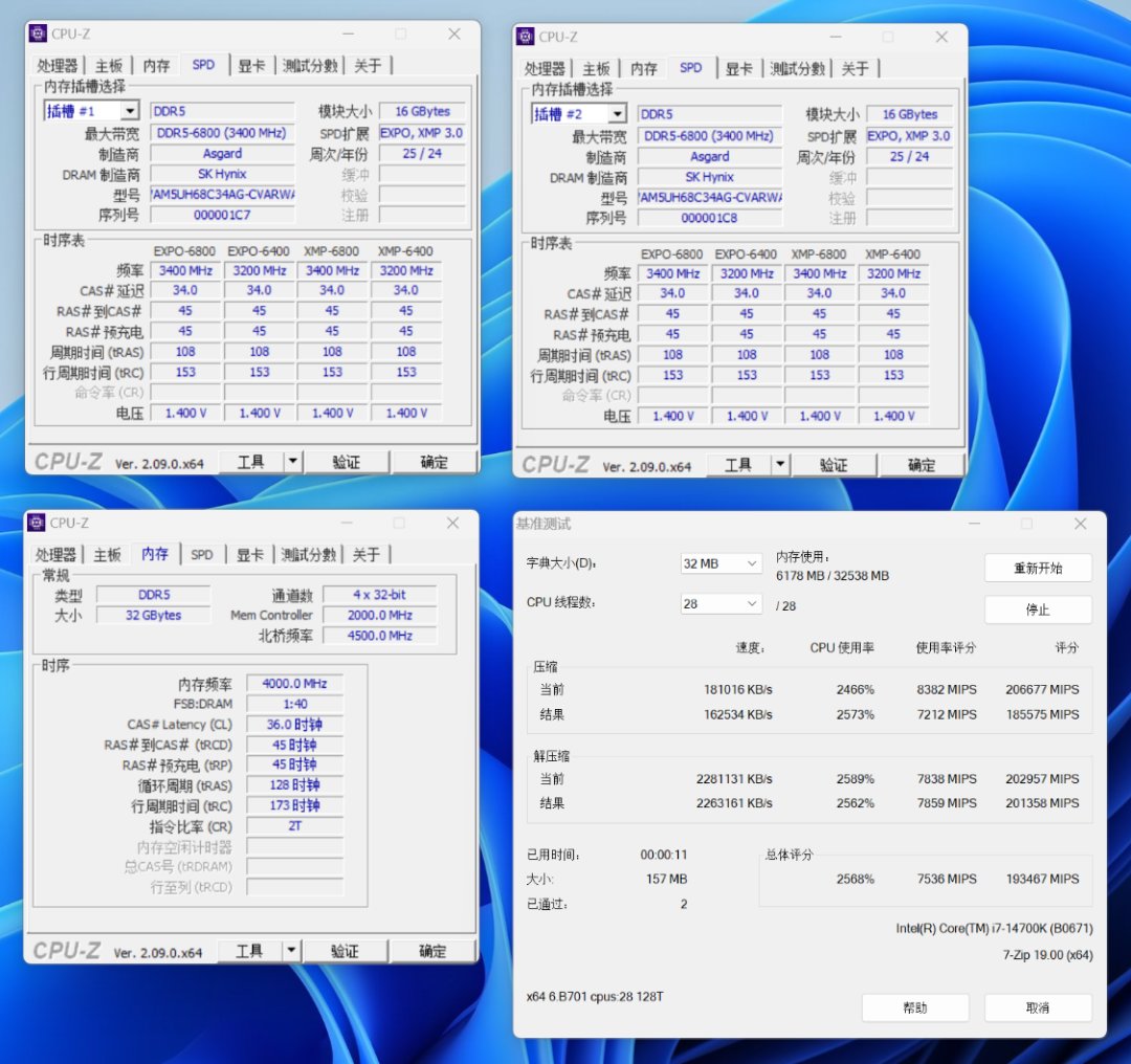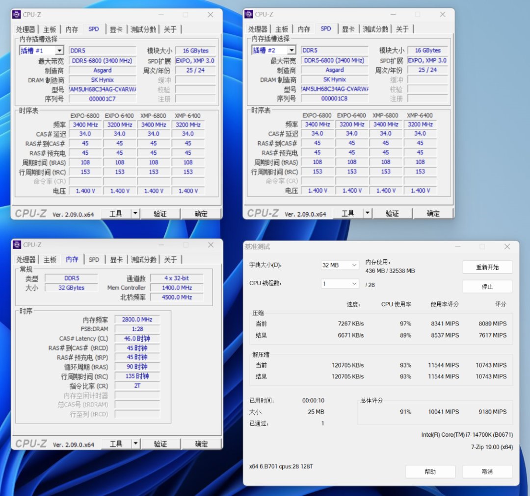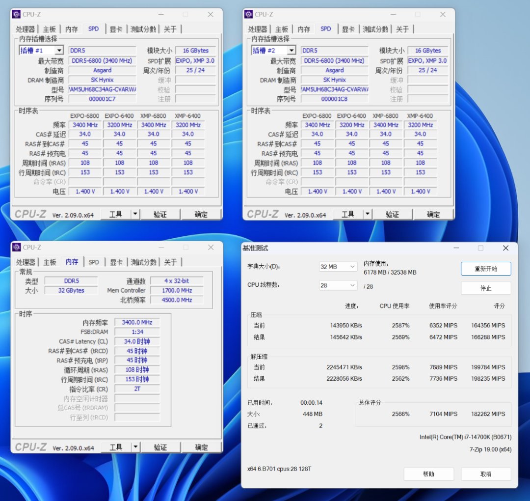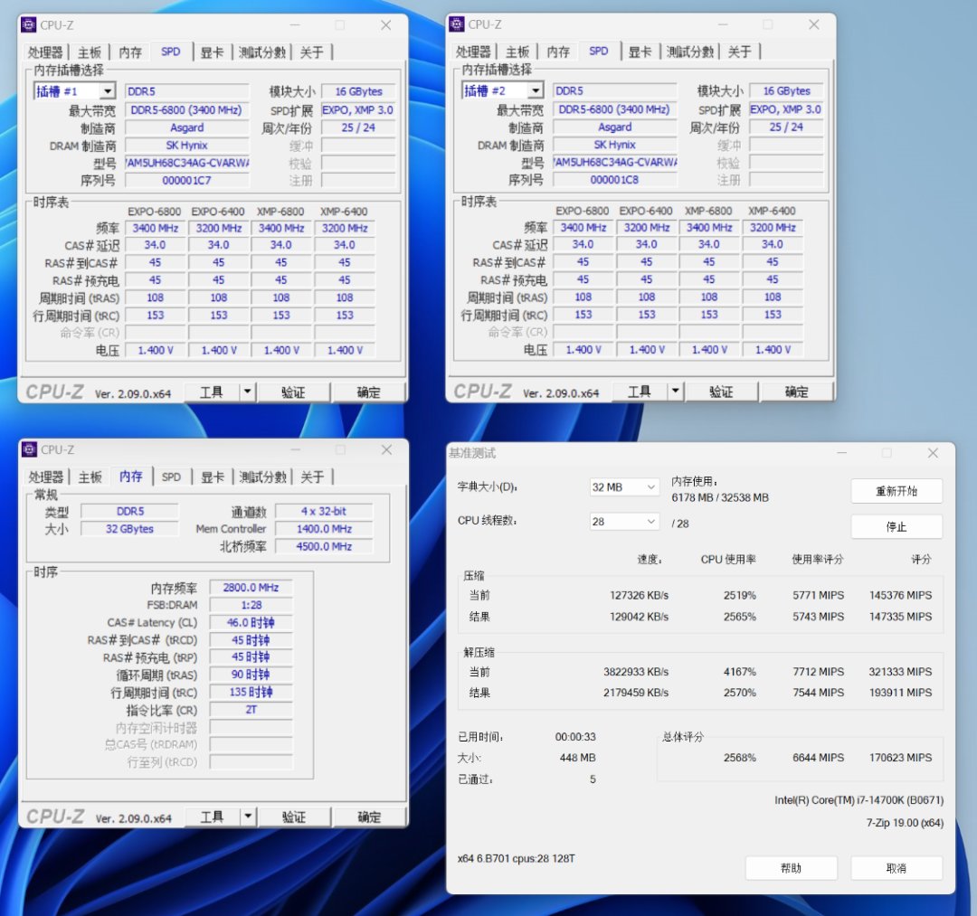 默頻(原生5600MHz)狀態下,多線程解壓縮評分可以達到170623 MIPS,單線程解壓縮評分可以達到9180 MIPS;