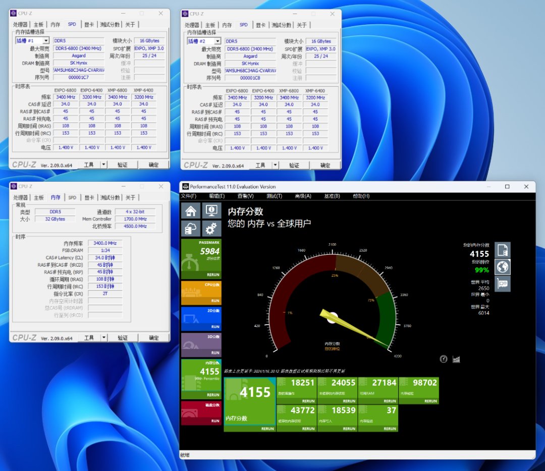 使用Memory Try It!將內存OC至8000MHz C36,內存得分44.4W分;