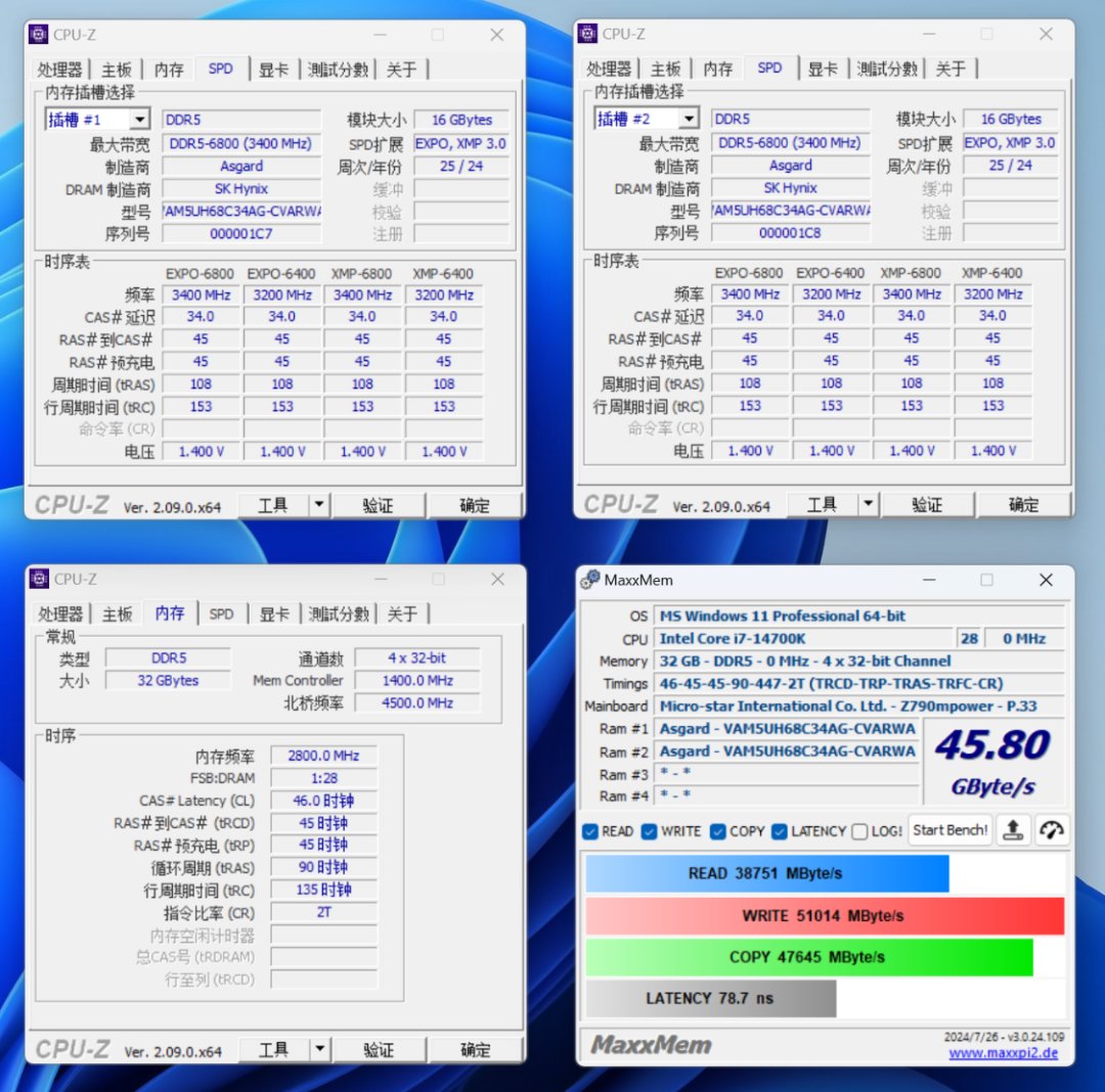 默頻(原生5600MHz)狀態下,內存讀寫帶寬爲45.80 GByte/s;