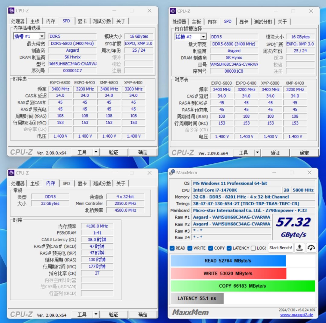 繼續將內存OC至8200MHz C38,並在Memory Extension Mode中選擇Benchmark Mode,內存讀寫帶寬爲57.32 GByte/s;
