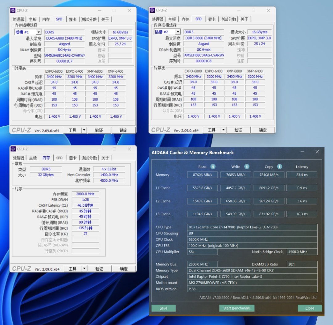 默頻(原生5600MHz)狀態下,內存讀取速度爲87606 MB/s,寫入速度爲76853 MB/s,複製速度爲78108 MB/s,延時爲83.4 ns;