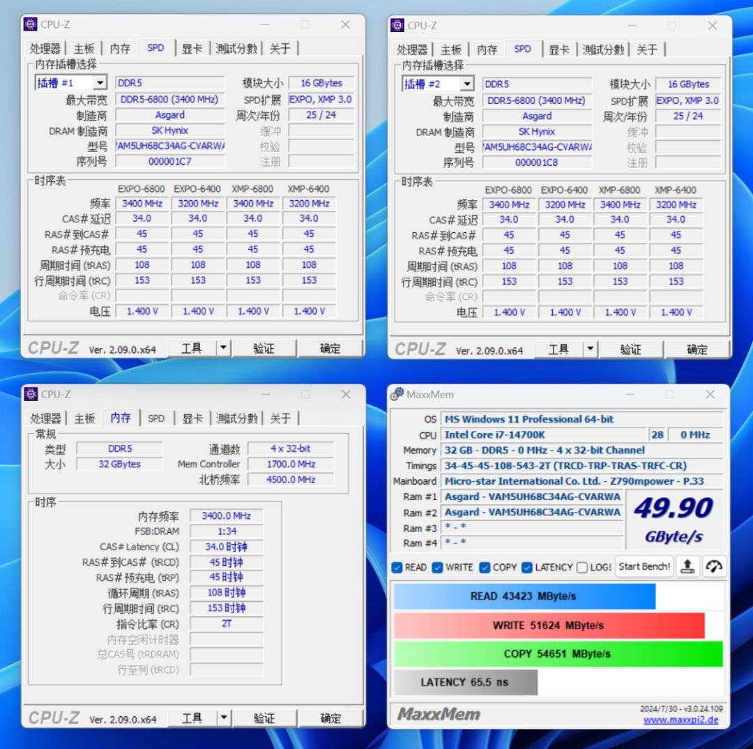 將內存XMP至6800MHz後,內存讀寫帶寬爲49.90 GByte/s;