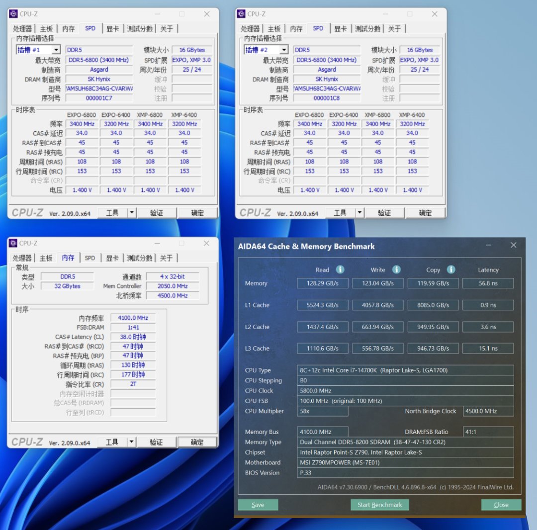 繼續將內存OC至8200MHz C38,並在Memory Extension Mode中選擇Benchmark Mode,內存讀取速度爲128.29 GB/s,寫入速度爲123.04 GB/s,複製速度爲119.59 GB/s,延時爲56.8 ns;
