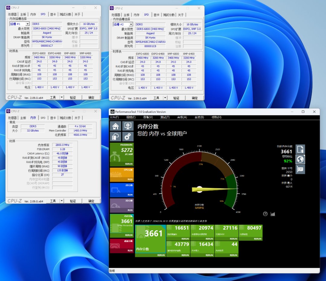 默頻(原生5600MHz)狀態下,內存得分3661分;
