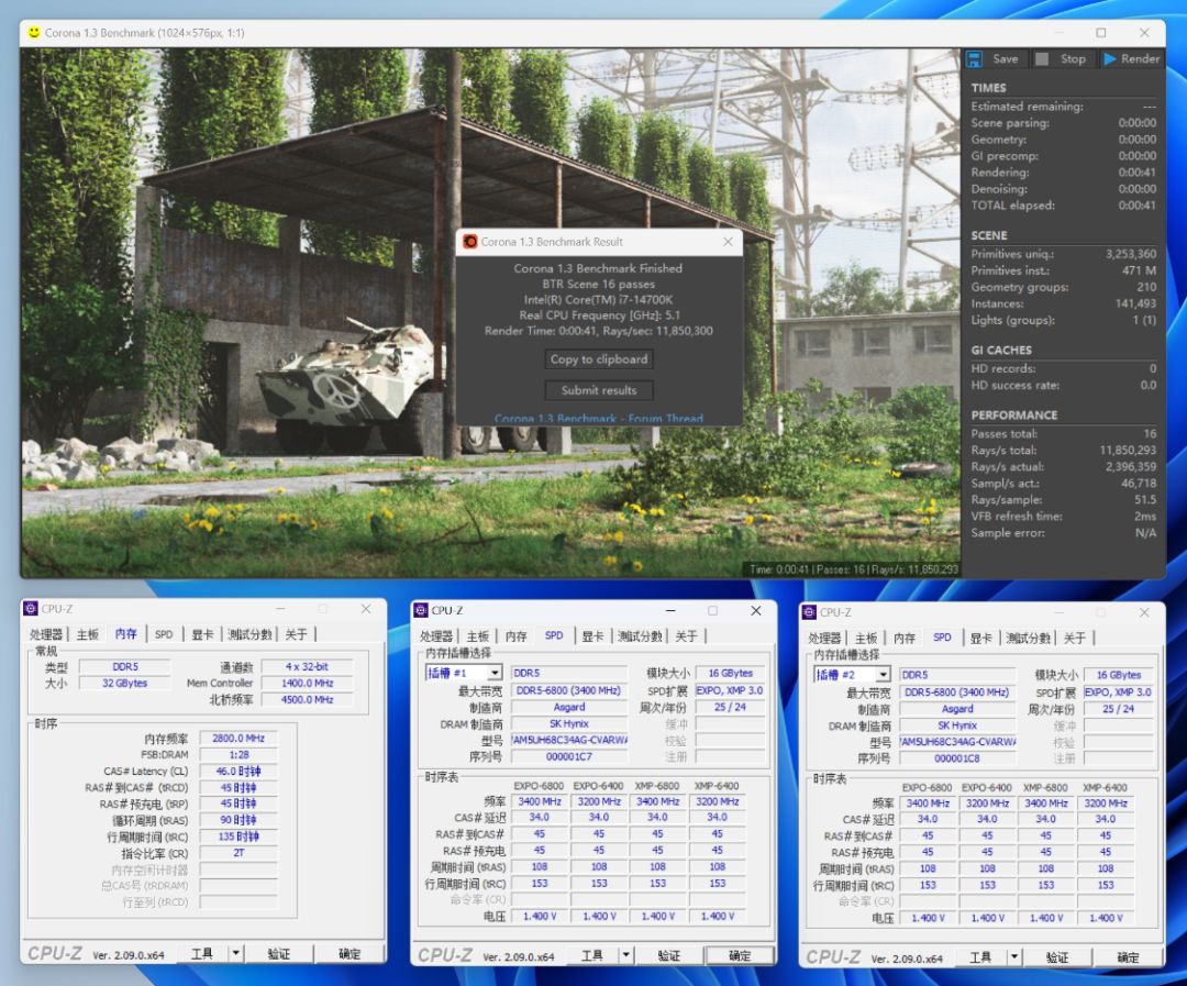 默頻(原生5600MHz)狀態下,渲染耗時41秒,渲染速度11850300 Rays/Sec;