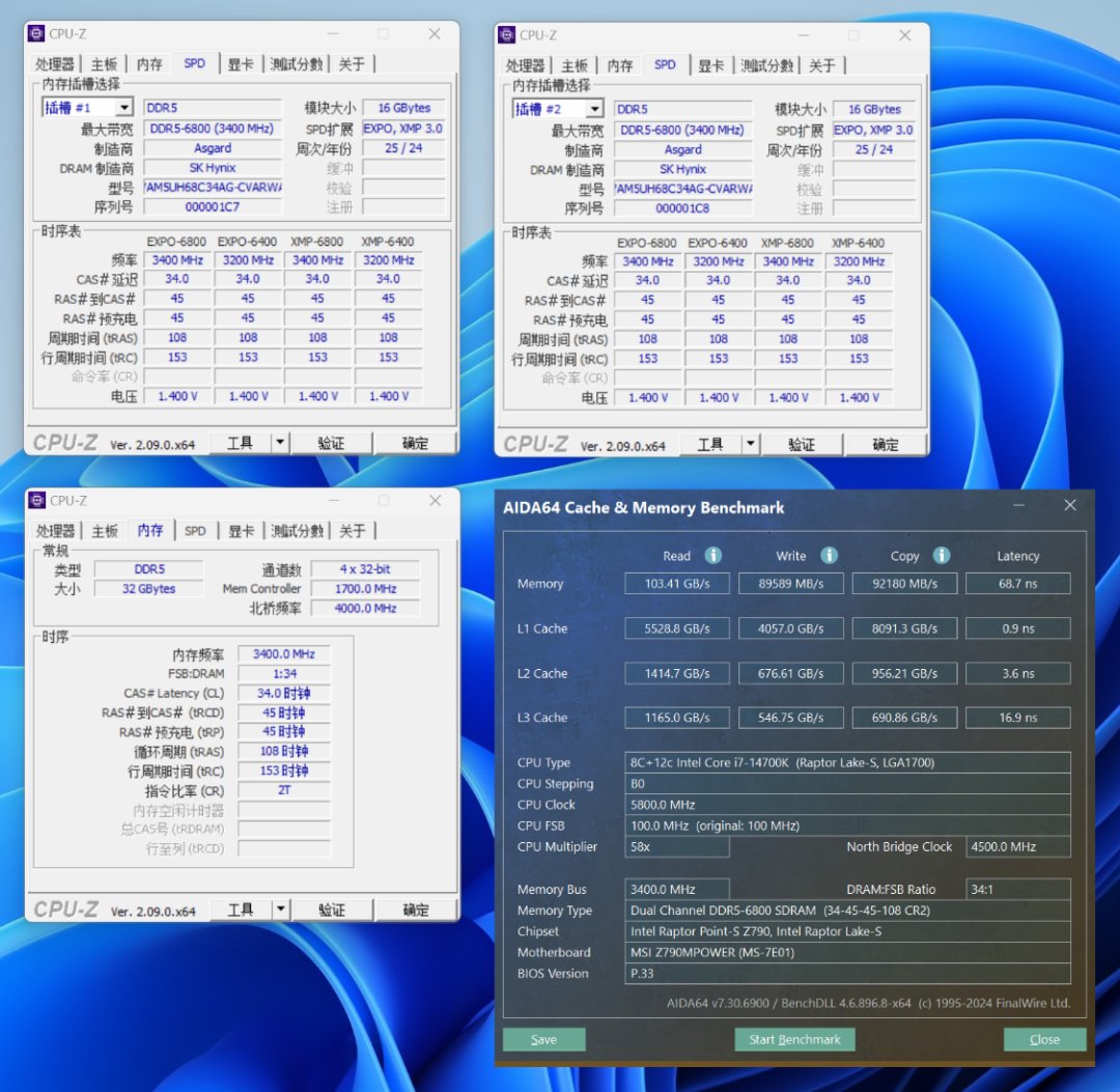 將內存XMP至6800MHz後,內存讀取速度爲103.41 GB/s,寫入速度爲89589 MB/s,複製速度爲92180 MB/s,延時爲68.7 ns;