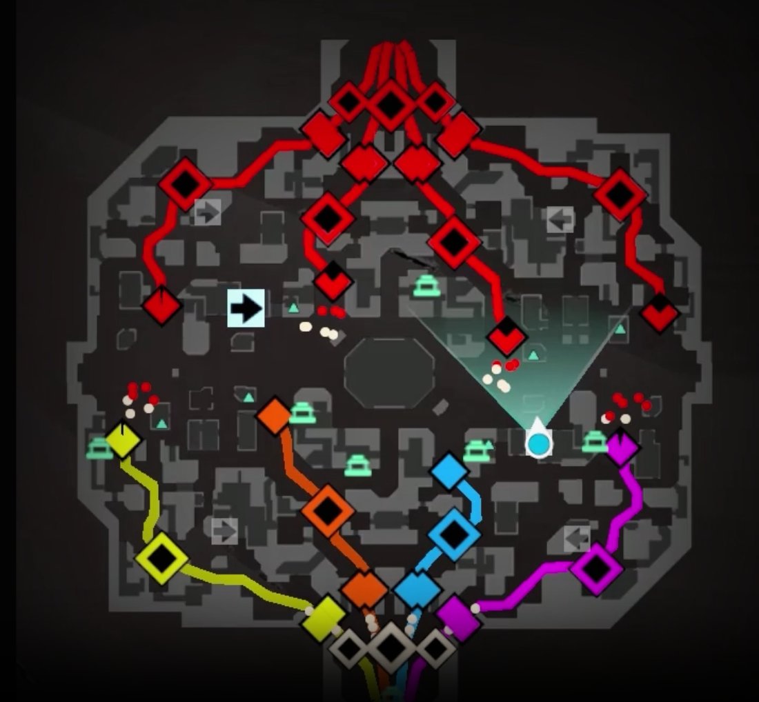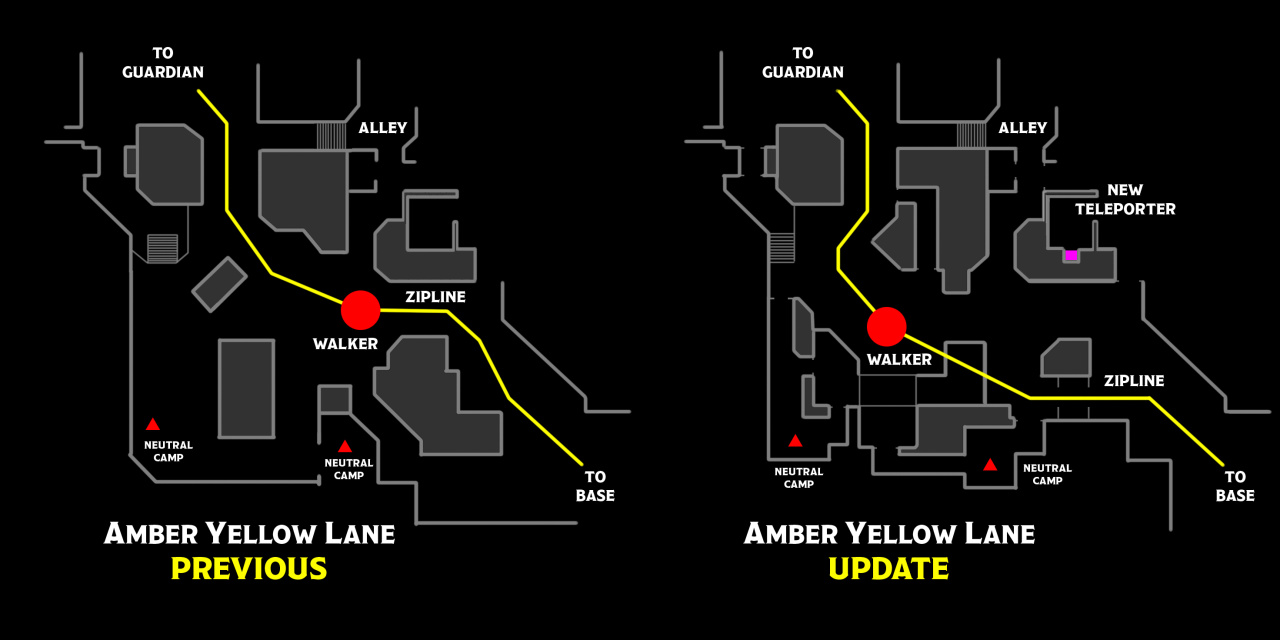 - 重新設計了琥珀之手(黃色方)黃線和藍晶之焰(藍色方)紫線上步行者的位置。它們距離地圖邊緣稍遠一些。附近的地形也已重新設計。