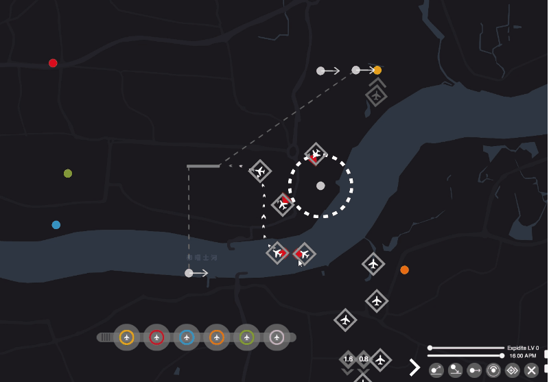 遊戲呢主要就是讓飛機從待機點起飛,飛機有不同的顏色,不同的顏色要降落到對應顏色的機場,期間還會有白色的飛機從邊界飛來,而白色飛機要降落在起飛跑道哪裏。