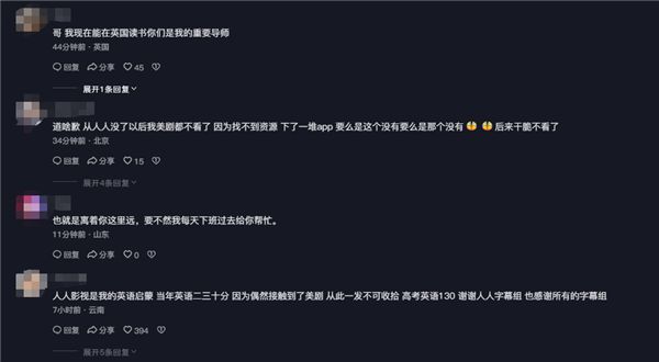 有網友看完視頻表示:“無需道歉,而是我們欠你一個會員”“雖然但是,你們翻譯的老友記、越獄、迷失、絕命毒師、英雄、CSI系列…陪我度過了整個高中大學和研究生時代”“人人影視是我的英語啓蒙 當年英語二三十分 因爲偶然接觸到了美劇 從此一發不可收拾 高考英語130”。