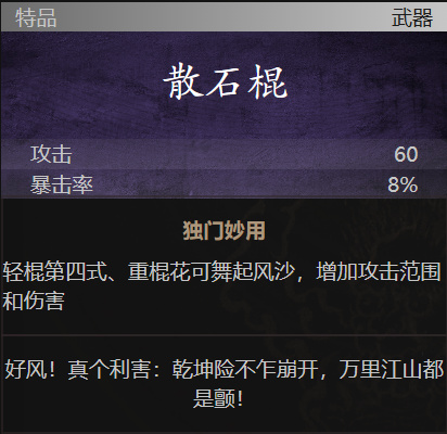 獨門妙用:輕棍第四式、重棍花可舞起風沙,增加攻擊範圍和傷害