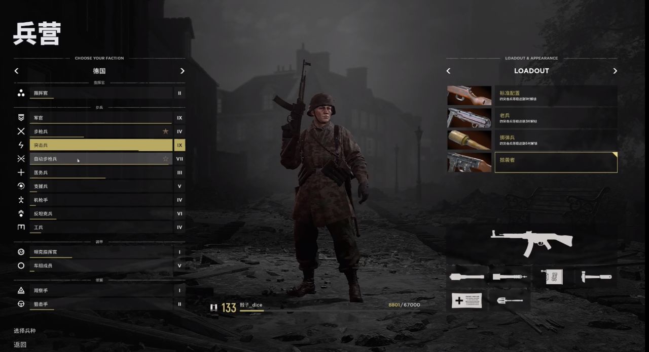 近戰絞肉機,攜帶短槍上陣,裝配擲彈兵時可以使用多顆手雷和煙霧彈,突進能力較強。平地衝鋒時推薦先投擲煙霧彈阻礙敵軍視線,靠近後向掩體後丟出手雷。九級突擊兵也可以攜帶3kg,炸燬敵軍坦克或清空樓房。
