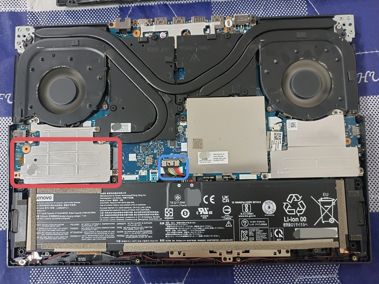 (紅色框是固態硬盤加盤的地方,藍色框是電源排線。)