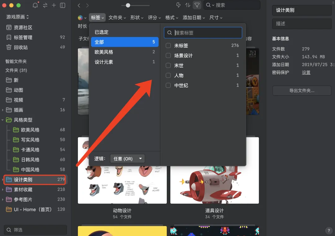 標籤與文件夾系統是聯動的,選中某個文件夾後,只會出現本文件夾中素材擁有的標籤,還可以選擇羣組以加快篩選。