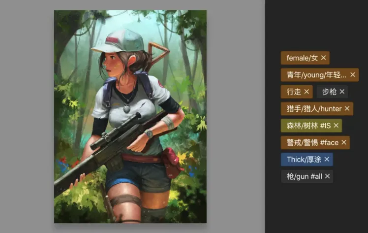 但如果你根據圖片內容,完整的給它打了標籤,比如圖內包含【女性、槍械、持槍、森林】等元素,那麼在你創作後期,比如你剛好需要畫「持槍姿勢」,直接一個關鍵詞就能精準搜索到。