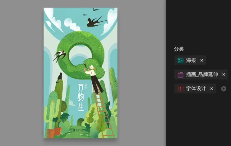 例舉一個使用場景,比如這張既可以歸類到海報,畫面的字體設計對於你來說也值得參考,那麼也可以歸類到字體設計中,同時這是一張品牌相關的宣傳,你也可以把它丟到品牌延伸類別中。
