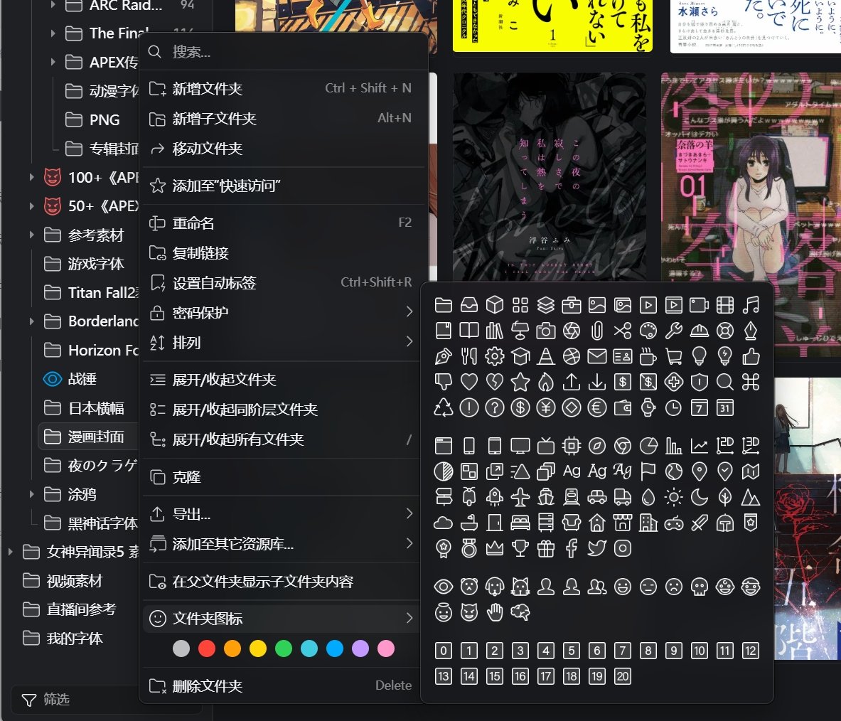 當分類的文件夾過多後,默認灰色的文件夾圖標難免會看得視覺疲勞,所以 Eagle 支持自定義文件夾圖標和色彩,以便用戶設置後文件夾便於辨認。