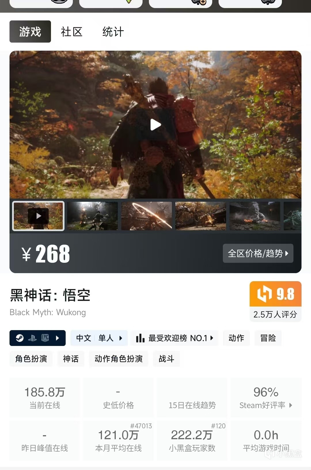 上一個超越CS2的是《帕魯》的210w,《帕魯》當時的這個成績花了8天時間。而根據小黑盒玩家數量,《悟空》具備今晚超越《帕魯》的硬性條件