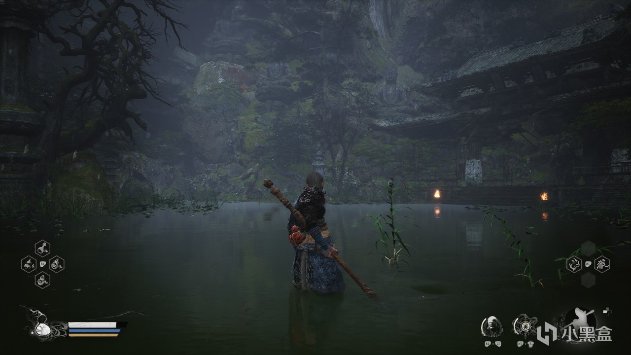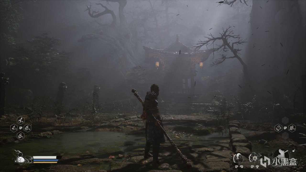最後提一嘴,樹上吊着的那個白狼身上有遊戲裏能見到的第一個法寶,可以提供抗火屬性,打最終boss黑熊精會好打一點,雖然我還是死了很多次。