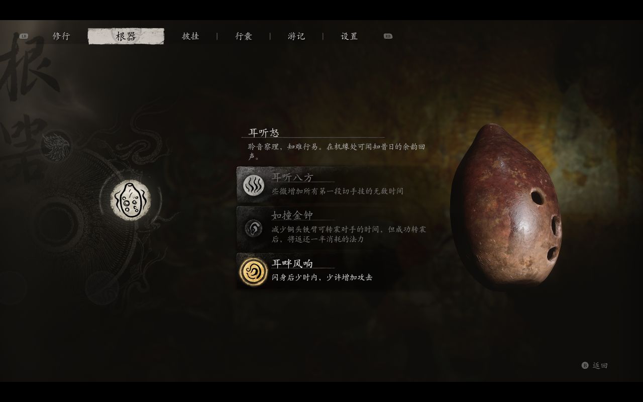 根器個人覺得還是以棍勢和傷害爲主,耳聽八方也可以選擇。聚形散氣不常用,銅頭鐵臂還是需要玩家操作,所以儘量大道至簡,把自身數值拉上來。