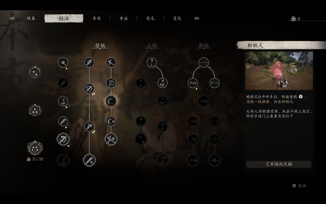 前期點數不多,建議主要點在更容易連招的劈棍式上,立棍和殘棍只需點出個別技能,等後續點數充足時再考慮其他